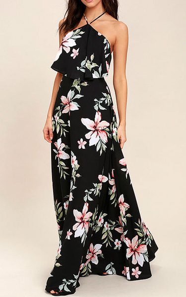 Ready for your next island party? Me too! The Peninsula Black Floral Print Maxi Dress is a lovely maxi dress. The majority of this dress is black but you will see big floral prints that are soft shades of pink, white and green leaves. Lovely!