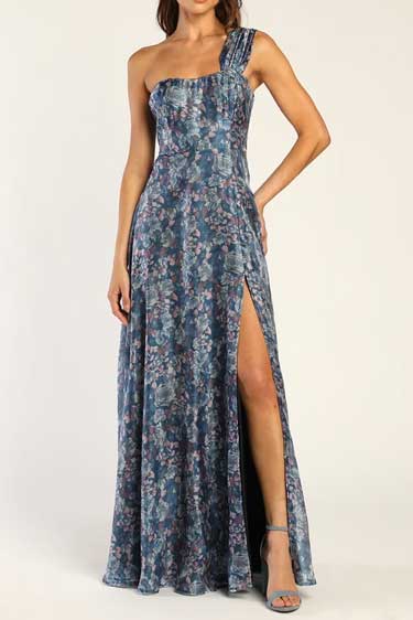 Order the Happily Mine Slate Blue Floral Print One-Shoulder Maxi Dress Here.
