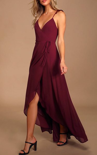 Order the Here's to Us Burgundy High-Low Wrap Dress Here.